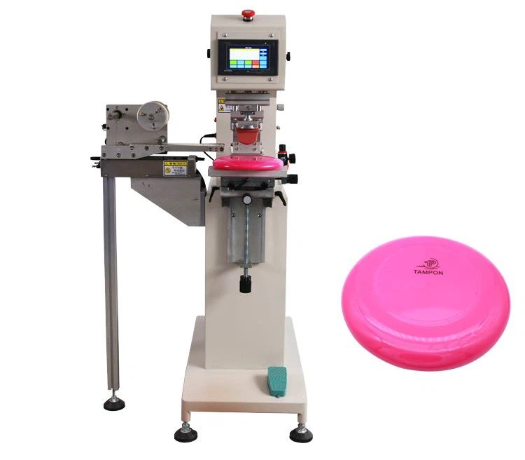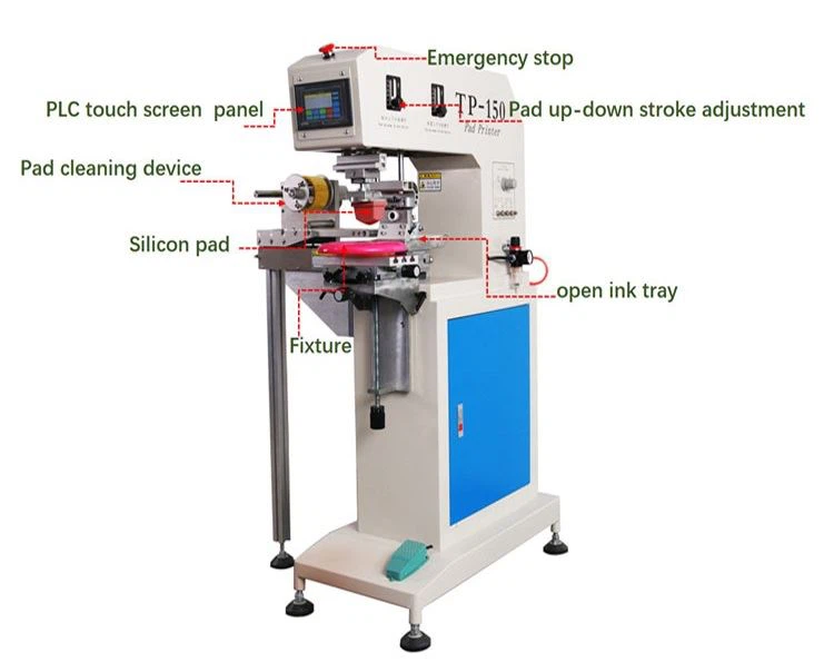 Abra la impresora de almohadilla de la bandeja de tinta. En este tipo de máquina de tampografía, la almohadilla de silicona para tampografía se mueve hacia arriba y hacia abajo, y hay una placa de acero para tampografía debajo. La tinta en la bandeja de tinta se raspa en la placa de acero mediante el dispositivo de raspado de tinta de arriba, y la almohadilla de silicona de tampografía entra en contacto con la placa de acero para aplicar tinta. Este esquema de diseño es simple y ampliamente utilizado en impresoras de tampón de gran volumen.